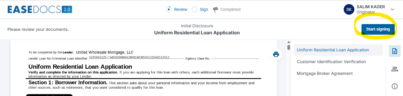 Once you have successfully logged in - click "start signing" button.