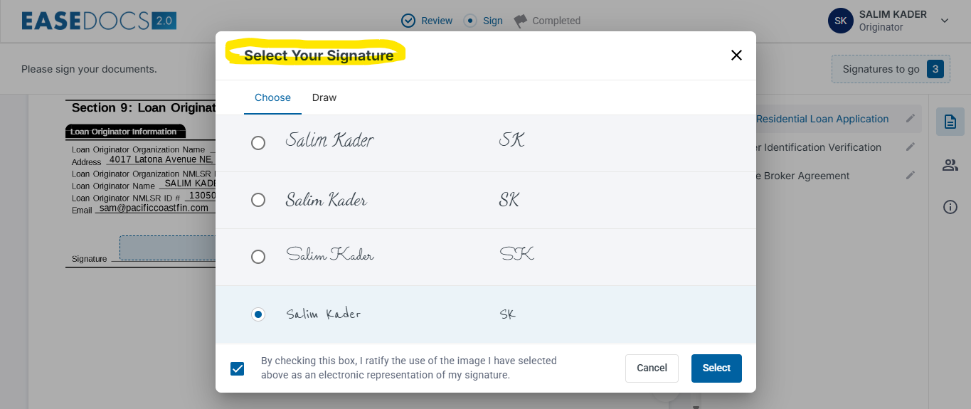 Select your signature style and start your e-signing process.