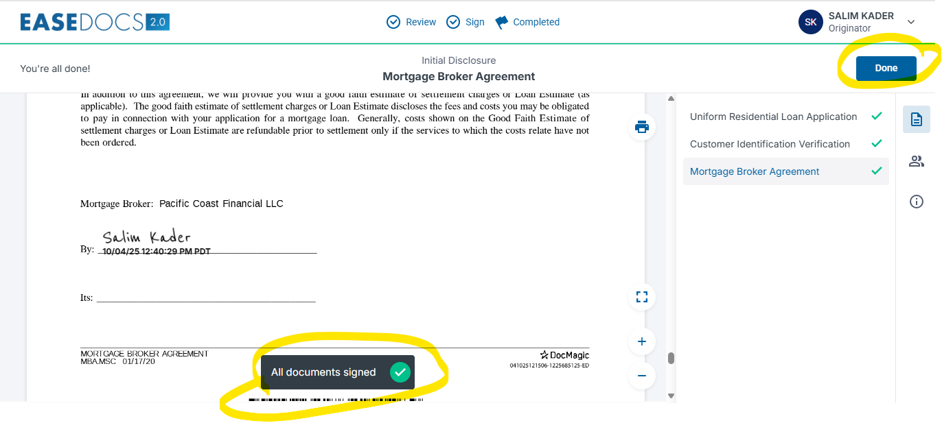 The system will guide you to appropriate spaces to e-sign. Simply click "sign".
