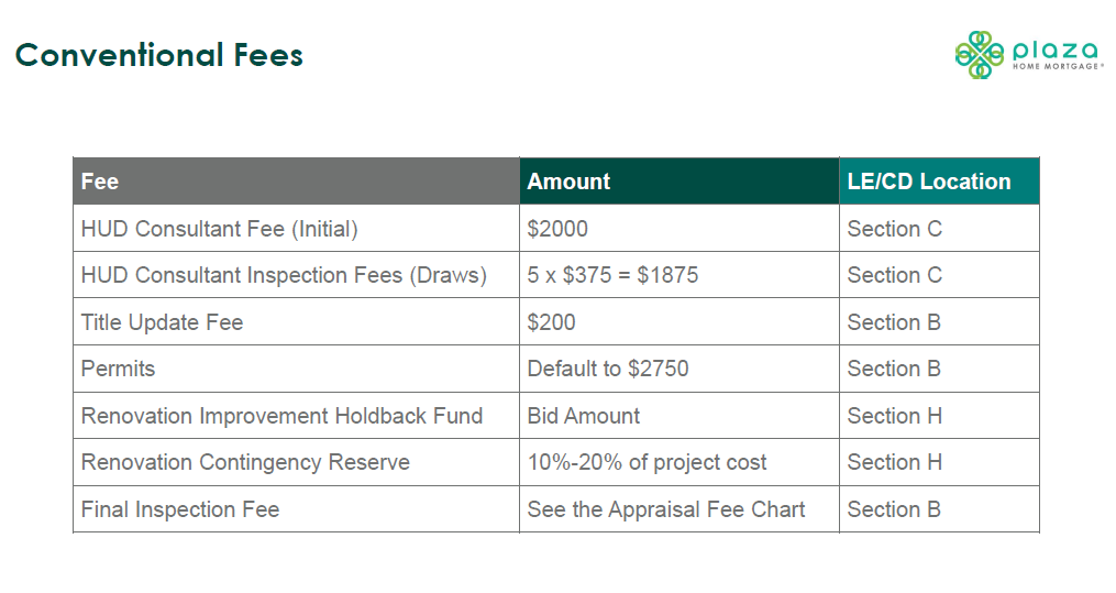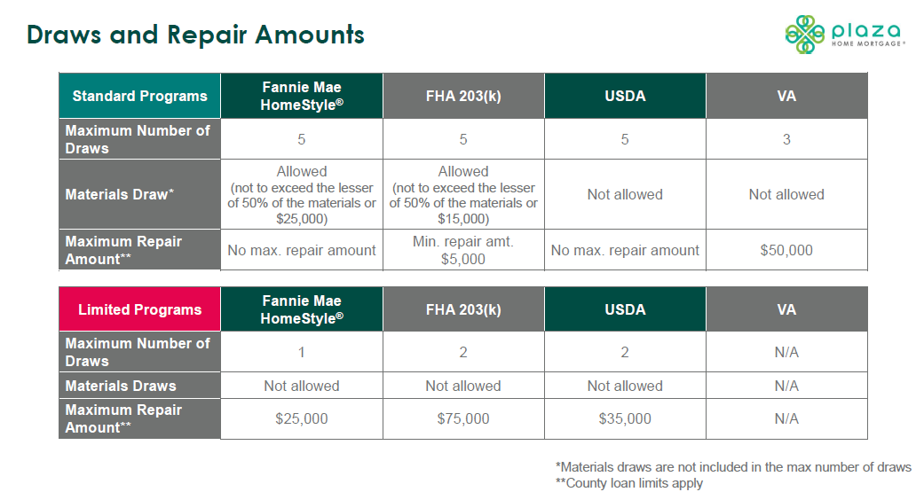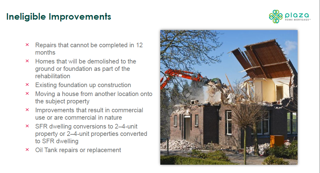 These points are taken from the Plaza Home Mortgage renovation comparison sheet and may reflect lender overlays or product variations in addition to base agency rules.